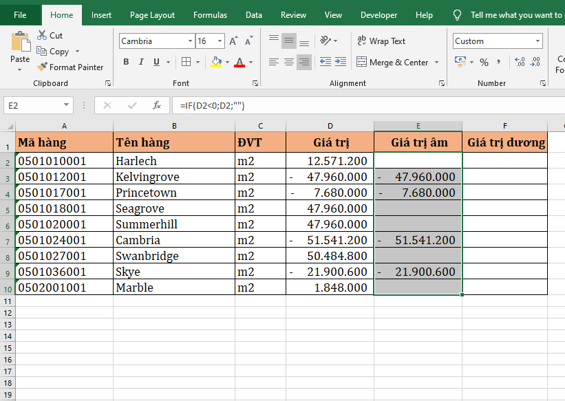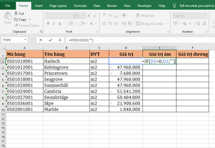 Bước 1: Tách các số âm: nhập công thức hàm IF tại ô E2: =IF(D2<0;D2;””)