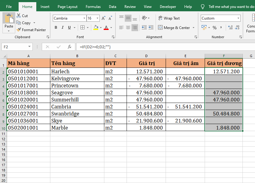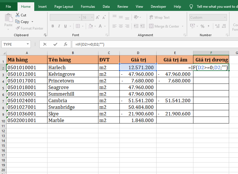 Bước 3: Tách các số dương ra, nhập công thức =IF(D2>=0;D2;””)