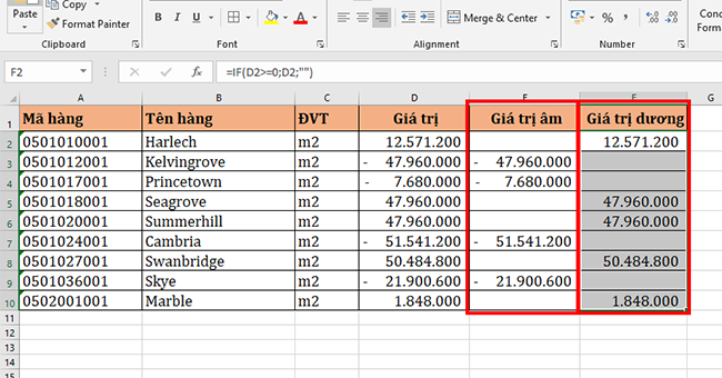 1.2. Cách sử dụng hàm IF để tách số âm và số dương
