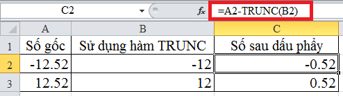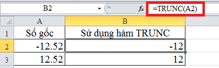 Trong ví dụ dưới đây, để tiến hành loại bỏ phần thập phân phía sau dấu phẩy của số gốc là -12.52 và 12.52. Khi đó bạn chỉ cần nhập như sau: =TRUNC (A2).