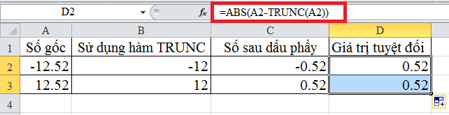 Nếu bạn muốn phần thập phân luôn là số dương thì ta sẽ sử dụng kết hợp thêm hàm ABS như sau: