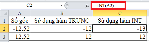 Khi đó kết quả trả về sẽ là -13. Tuy nhiên hàm INT(A2) cho kết quả tương đương với hàm TRUNC(A2) nhưng nếu A2 là một số âm thì kết quả sẽ khác nhau: