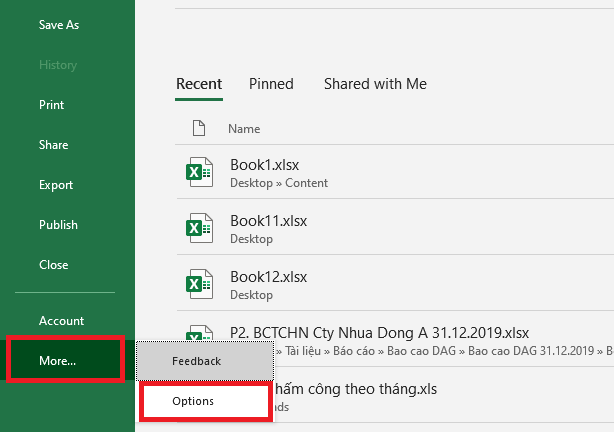 Bước 1: Đầu tiên, các bạn cần mở file Excel cần tạo nút Up and Down lên. Sau đó các bạn chọn thẻ File trên thanh công cụ. Tại giao diện của thẻ File thì các bạn chọn mục More => Options.