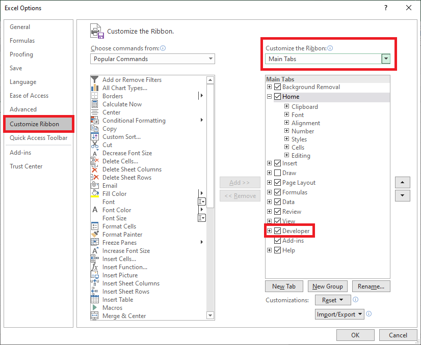 Bước 2: Lúc này, cửa sổ Excel Options hiện ra. Các bạn chọn mục Customize Ribbon ở danh mục bên trái. Sau đó chọn Main Tabs tại mục Customize the Ribbon. Tiếp theo các bạn tích chọn vào mục Developer. Cuối cùng nhấn OK để hoàn tất.