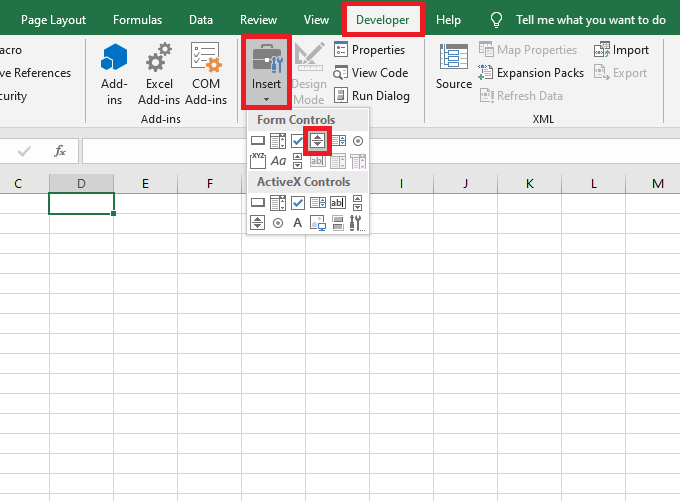 Bước 3: Lúc này, thẻ Developer đã hiển thị ở trên thanh công cụ. Các bạn chọn thẻ này rồi chọn mục Insert. Thanh cuộn hiện ra thì các bạn chọn biểu tượng của Spin Button.