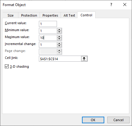 Cuối cùng các bạn nhấn OK để hoàn tất. Chỉ cần như vậy là chúng ta đã tạo thành công nút lên xuống trong Excel. Bây giờ mỗi khi các bạn nhấn lên hoặc xuống thì giá trị trong ô sẽ được thay đổi tùy theo giá trị mà bạn gán cho nó ở bảng Control.
