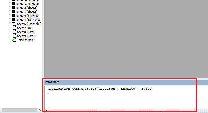 Application.CommandBars("Research").Enabled = False=> ấn Enter để chạy lệnh. - Nhân Alt + F4 để đóng VBA Editor.