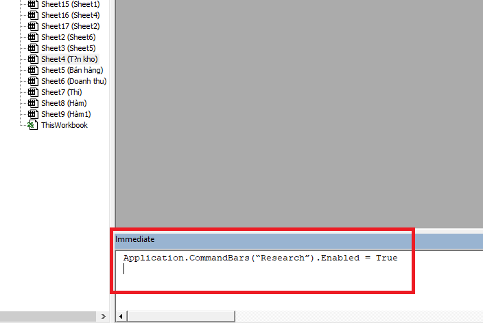 Để bật lại tính năng Research thì ta sẽ mở lại VBA => vào Immediate và nhập lệnh sau rồi chạy: