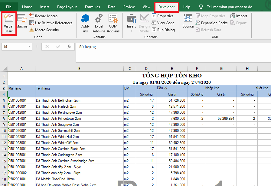 Để tắt Reseach, ta cần mở cửa sổ VBA như sau: chọn thẻ Developer => rồi chọn Visual Basic tại mục Code (hoặc sử dụng phím tắt Alt + F11)