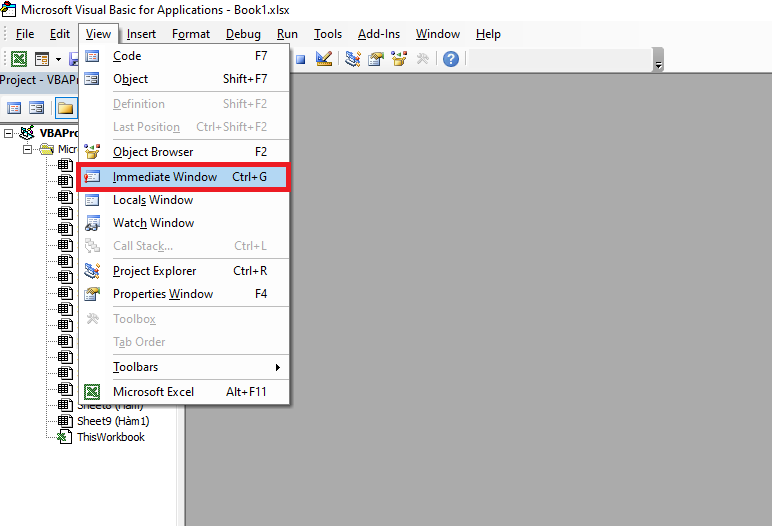 Bước 2: Mở Immediate Window và nhập lệnh tắt