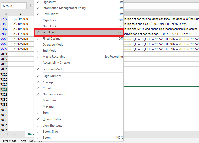 Để kiểm tra máy tính đang bật Scroll Lock không thì ta có thể Click chuột phải vào phía dưới cùng cửa sổ làm việc Excel > tại thanh cuộc hiện ra, ta chọn mục Scroll Lock > nếu trạng thái là On thì Scroll Lock đang bật.