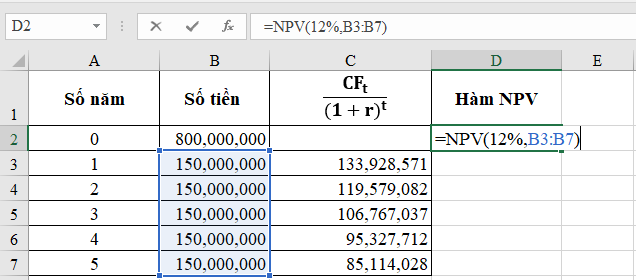 - NPV(B8, B4:B7): Phần này chỉ dùng để tính giá trị hiện tại của các dòng tiền thực sự ở trong tương lai. Trong kịch bản này, các dòng tiền tương lai bắt đầu từ ô B4 (300 triệu) đến ô B7 (500 triệu).