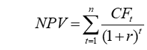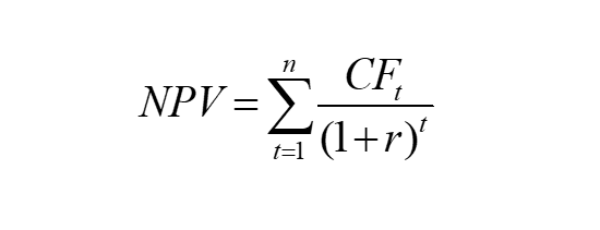 NPV bằng tổng từ t bằng 1 đến n của dòng tiền tại thời điểm t chia cho (1 cộng r) mũ t. Công thức tính NPV trong toán học như sau: