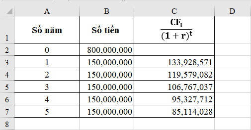 - Các dòng tiền còn lại từ B4 đến B7 sẽ được tính là dòng tiền tương lai, bắt đầu từ cuối Năm 1, cuối Năm 2,…