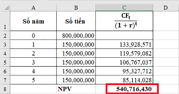 - + B3: Cộng trực tiếp dòng tiền đầu tiên (200.000.000), vì nó cũng được nhận ngay ở Năm 0.