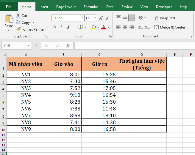 Áp dụng trực tiếp vào dữ liệu mẫu trong bài ta lần lượt tính giờ làm việc, ta giả sử như sau: