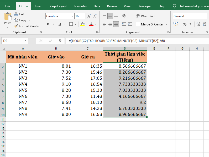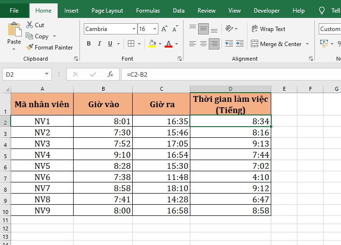 Cách đơn giản nhất để tính thời gian làm việc trên bảng chấm công chính là lấy giờ ra trừ giờ vào. Tại ô D2 các bạn nhập công thức như sau: