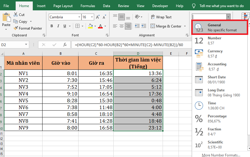 2. Công thức tính giờ làm việc