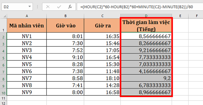 Bước 2. Tính thời gian làm việc bằng cách sử dụng hàm