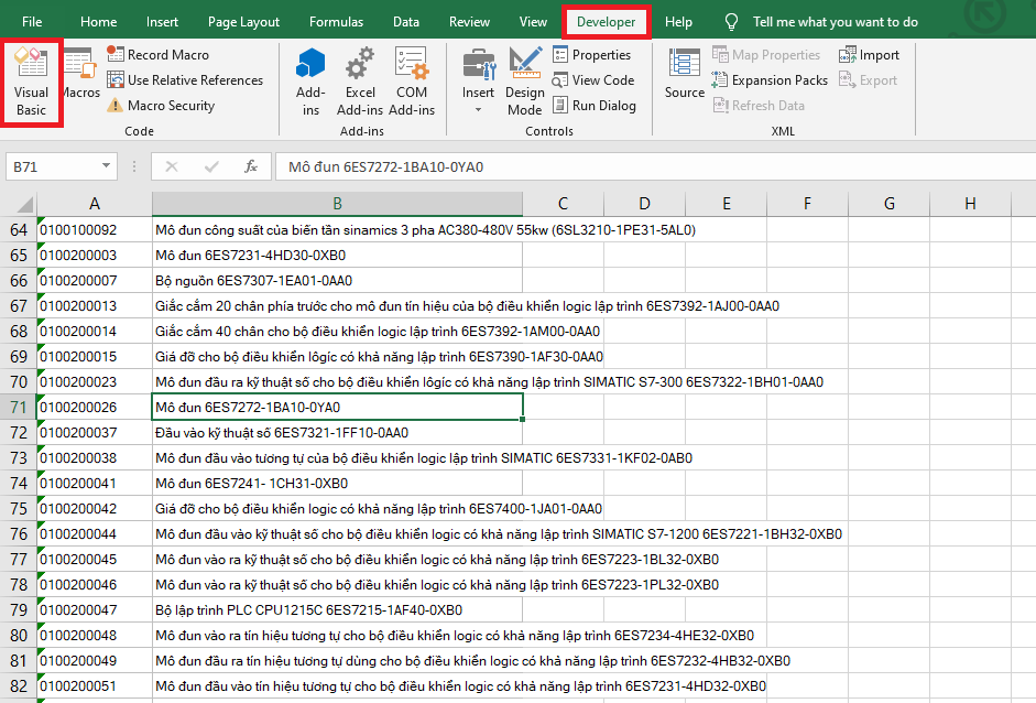 Để thiết lập tự động xuống dòng bằng code VBA, đầu tiên các bạn cần chọn thẻ Developer trên thanh công cụ. Sau đó các bạn chọn Visual Basic tại mục Code. Hoặc các bạn có thể sử dụng tổ hợp phím tắt Alt + F11 để mở cửa sổ VBA.