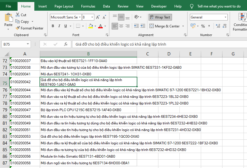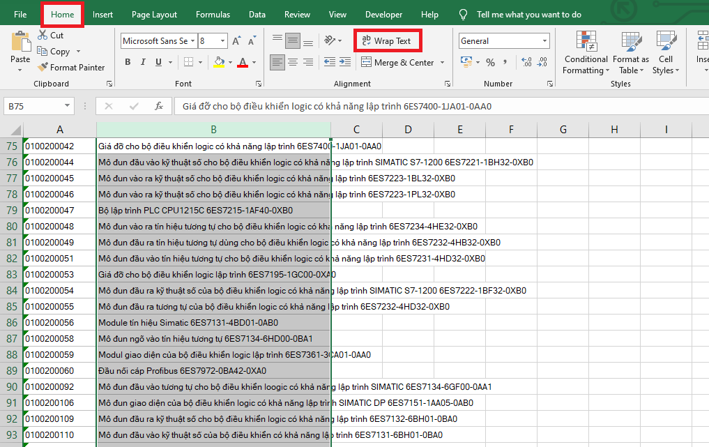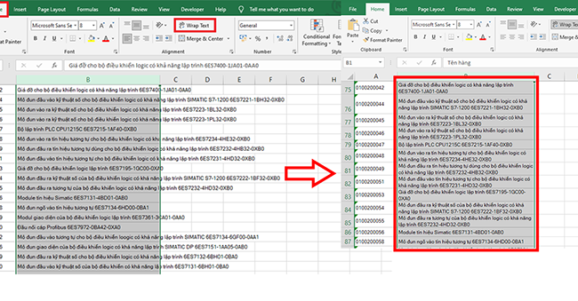 - Sử dụng Warp Text: Chọn ô/vùng dữ liệu => vào tab Home => bấm Warp Text.
