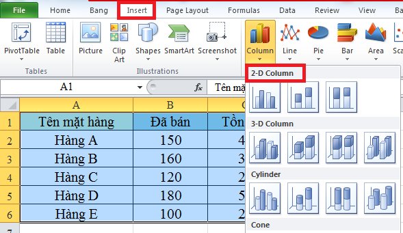 - Bước 1 – Tạo biểu đồ: Bôi đen vùng dữ liệu cần tạo biểu đồ (bao gồm cả tiêu đề) => chọn Insert => chọn Charts => chọn kiểu biểu đồ.