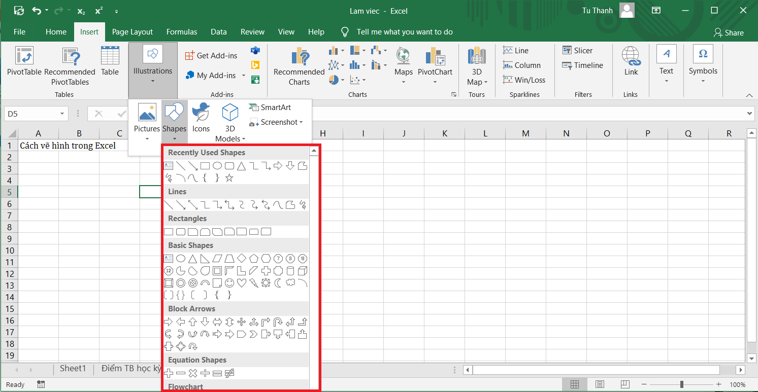 1. Cách vẽ hình trong excel bằng Shapes