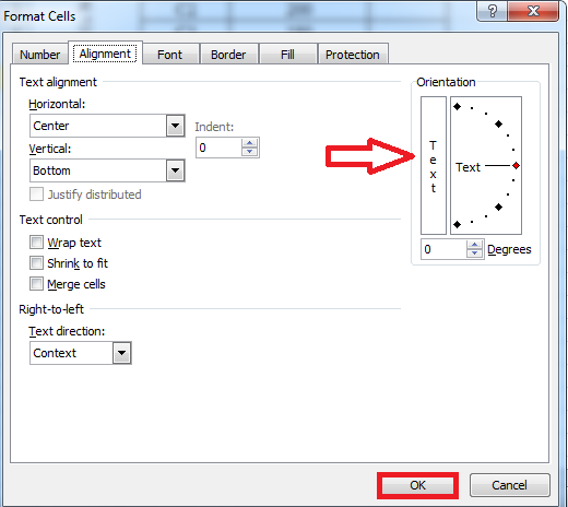 Khi ấy trên màn hình sẽ xuất hiện hộp thoại Format Cell. Tiếp theo bạn nhấn vào tab Aligment. Trong phần Orientation bạn có thể tiến hành xoay chứ theo ý muốn. Bạn có thể xoay bằng cách nhập góc xoay chữ hoặc di chuyển vị trí của mũi tên trong nửa vòng tròn. Khi lựa chọn được vị trí phù hợp, bạn ấn OK.