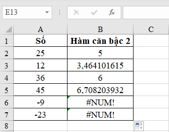 Trong đó: number là số cần tìm giá trị căn bậc hai và là tham số bắt buộc. Number bắt buộc phải là số dương, nếu number là số âm thì Excel sẽ báo lỗi #NUM. Number có thể là giá trị cụ thể hoặc địa chỉ của ô chứa giá trị.