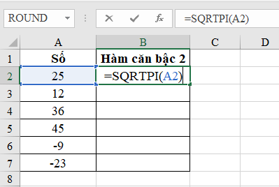 Ta cùng tham khảo ví dụ sau để hiểu rõ hơn cách sử dụng nhé. Tại ô B2 của bảng dữ liệu, ta nhập =SQRTPI(A2)hoặc=SQRTPI(25), sau đó Enter để hiển thị kết quả. Kết quả sẽ là căn bậc 2 của 25 nhân với π, tức 5xπ.
