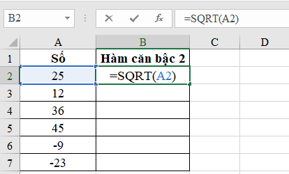 Ta cùng thử làm ví dụ sau để hiểu rõ hơn cách sử dụng của hàm này nhé. Giả sử ta có bảng dữ liệu cần tính toán căn bậc 2 như dưới đây. Ta sẽ bắt đầu với ô B2. Tại ô B2 các bạn nhập công thức: =SQRT(25) hoặc =SQRT(A2)(trong ngoặc là giá trị cụ thể hoặc địa chỉ chứa giá trị). Sau đó ấn Enter để hiện kết quả.