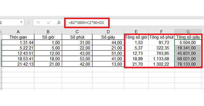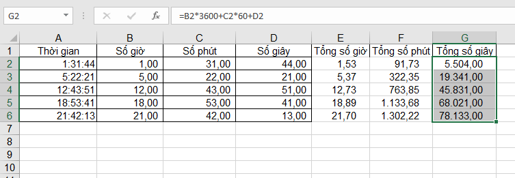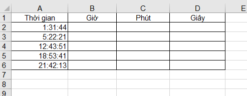 Cách 3: Sử dụng các hàm HOUR, MINUTE, SECOND