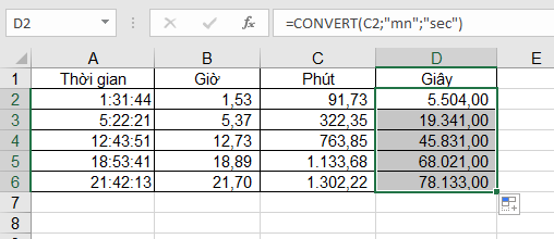=CONVERT(A2;”day”;”sec”) hoặc =CONVERT(B2;”hr”;”sec”) hoặc =CONVERT(C2;”mn”;”sec”)