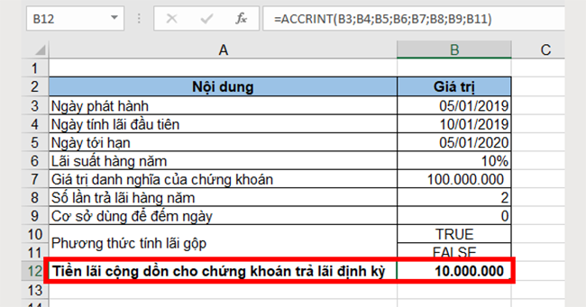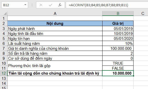 Như vậy, bài viết trên đã hướng dẫn các bạn cách sử dụng hàm ACCRINT để tính tiền lãi cộng dồn cho chứng khoán trả lãi định kỳ. Chúc các bạn thành công!