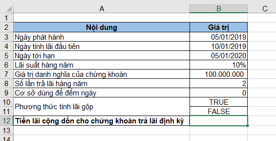 - [calc_method] (Tùy chọn): Phương pháp tính toán lãi. Có thể bỏ qua, mặc định là FALSE. Nếu được đặt thành TRUE, hàm sẽ sử dụng phương pháp tính lãi theo cách chính xác hơn.