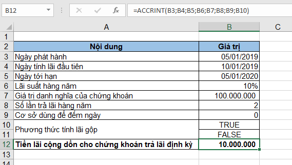 Ta áp dụng công thức hàm ACCRINT như sau: