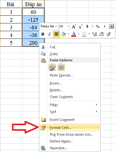 Trong trường hợp nếu bạn muốn bôi đỏ các số âm trong bảng dữ liệu mà vẫn giữ dấu “-” đằng trước thì chúng ta tiến hành tương tự. Bạn cũng bôi đen vùng số ấm muốn định dạng sau đó kích chuột phải và chọn Format Cells….