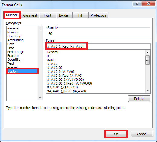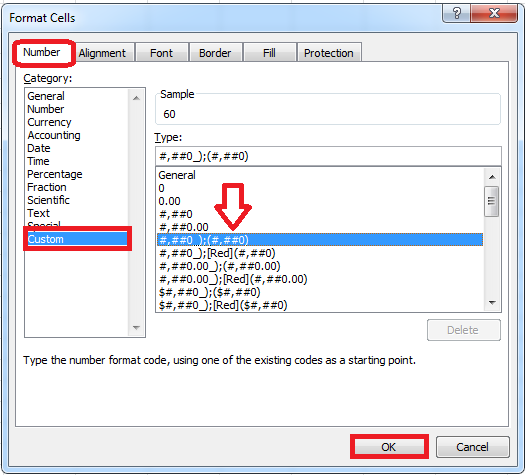 Khi ấy trên màn hình sẽ xuất hiện giao diện cửa sổ Format Cells. Người dùng ấn chọn tab Number. Tại đây, ở phần Category chúng ta sẽ chọn mục Custom. Nhìn sang bên phải bạn hãy tìm đến định dạng #,##0_);[Red](-#,##0) trong mục Type. Khi đã thực hiện xong thao tác, bạn nhấn OK để hoàn tất.