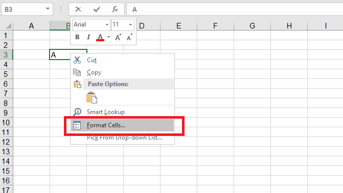 Bước 1: Bạn nhập A vào ô trong Excel sau đó nhấn chuột phải và chọn Format Cells hoặc nhấn tổ hợp phím tắt Ctrl + 1.