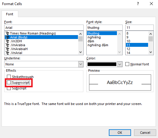 Bước 2: Hộp thoại Format Cells xuất hiện. Tại mục Effects => đánh dấu tích chọn mục Superscript. Sau đó nhấn OK.