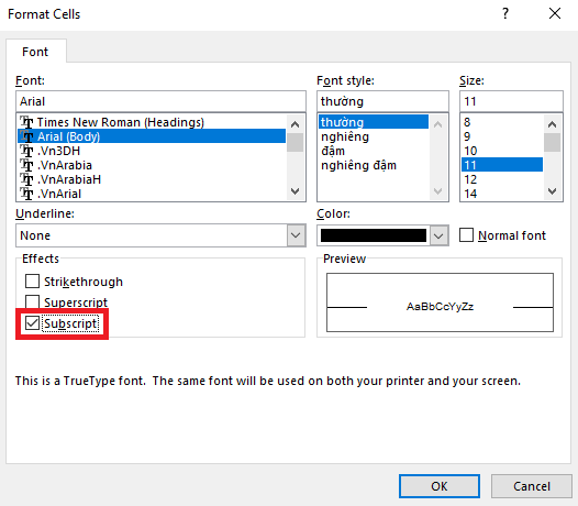 Tương tự nếu bạn muốn viết chỉ số dưới => bạn mở hộp thoại Format Cells và đánh dấu tích chọn mục Subscript để nhập chỉ số dưới.