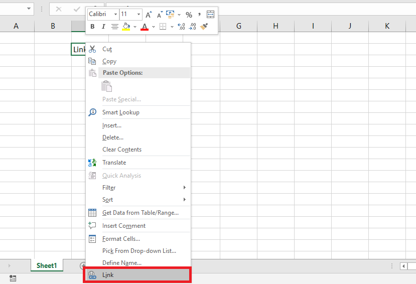 - B3: Nhấn tổ hợp phím Ctrl + K hoặc nhấp chuột phải vào ô/ảnh đã chọn và chọn “link” hoặc “Hyperlink“.