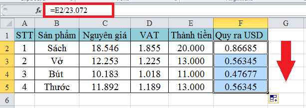 Theo như tỷ giá hiện giờ thì 1USD = 23.072,00 VNĐ. Vì vây ta áp dụng công thức = E2/23.072 để chuyển đổi đơn vị tiền tệ sang USD.
