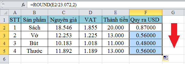 Tuy nhiên khi bạn muốn làm trò đến hai chữ số thập phân của đồng USD thì bạn cũng thực hiện như trên. Bạn nhập công thức của hàm ROUND tại ô F2 =ROUND(E2/23.072,2)
