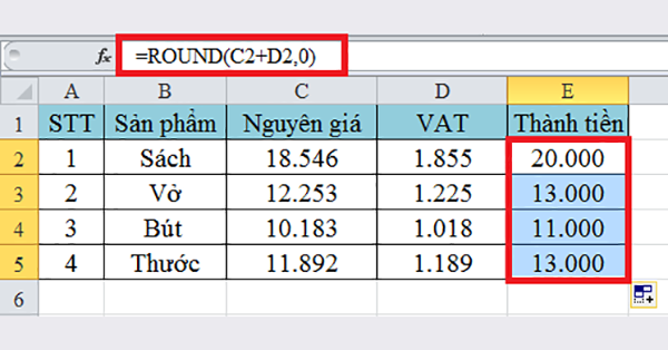 Thực hiện tương tự nếu bạn muốn làm tròn tại mục thành tiền. Tại ô E2 bạn nhập công thức như sau: =ROUND(C2+D2,0). Khi đó trên màn hình sẽ hiển thị kết quả như hình sau: