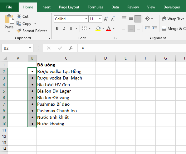 Cách nhanh nhất để chèn ký hiệu bullet (•) vào trong Excel là sử dụng phím tắt, cách thực hiện như sau: