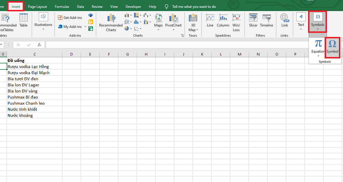 - Trên thanh công cụ, chọn Insert → Symbols → Symbol.
