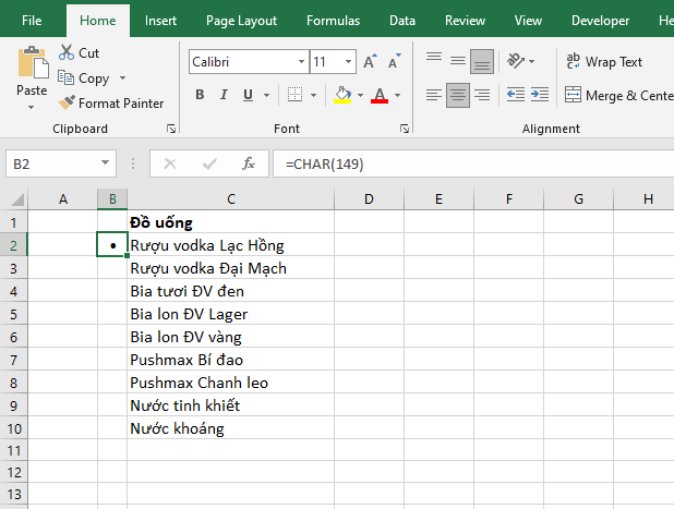 Hàm CHAR() cho phép tự động tạo ký tự đặc biệt, bao gồm cả ký hiệu bullet. Nếu muốn thêm bullet bằng công thức thì ta sẽ sử dụng hàm CHAR tại ô cần chèn với công thức sau: