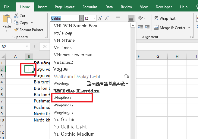 - Chọn ô → Vào thẻ Home → Font, đổi font chữ thành Wingdings.