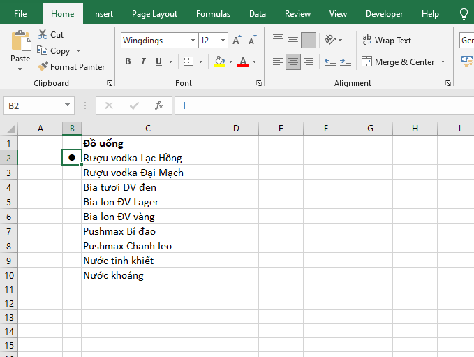 Font Wingdings trong Excel chứa nhiều ký tự đặc biệt, trong đó có bullet. Cách này giúp tạo bullet chỉ bằng 1 ký tự duy nhất.